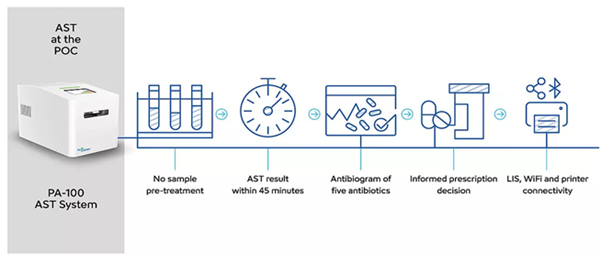 Unlike conventional methods that wait for bacteria to grow in a lab over days, the PA-100 uses advanced nanofluidic technology combined with phase-contrast microscopy to observe bacteria at a single-cell level [6].