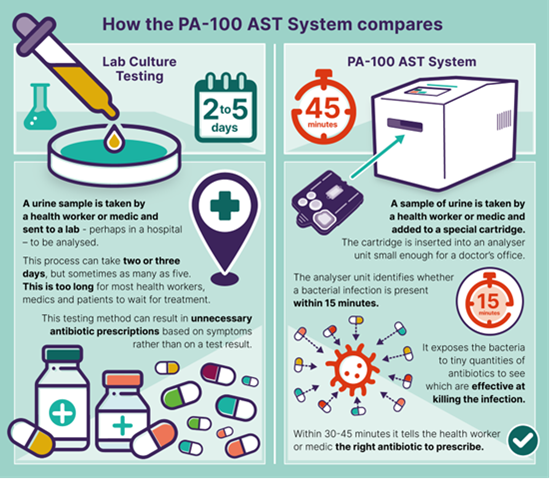 The system provides two critical answers within a single doctor’s visit which includes; whether bacteria are present and, crucially, which specific antibiotic will kill them [5].