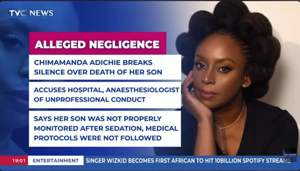 - Chimamanda Ngozi Adichie Issues Legal Notice to Lagos Hospital. TVC News. https://www.tvcnews.tv/chimamanda-adichie-issues-legal-notice-to-lagos-hospital-over-sons-death/