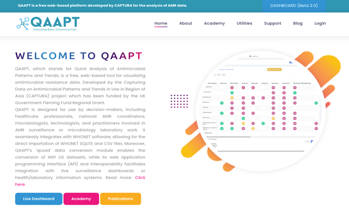 • QAAPT (Quick Analysis of Antimicrobial Patterns and Trends): This is a powerful, AI-driven, web-based tool developed under the Capturing Data on Antimicrobial Resistance Patterns and Trends in Use in Regions of Asia (CAPTURA) project. It lets users upload lab data and instantly see real-time visualizations, charts, trends over time, antibiograms (resistance patterns), and more [8]. You can apply filters (like by age, sex, specimen type, or date), ask questions in everyday language for quick answers, generate dashboards for surveillance and reporting, and export results in formats like PDF, Excel, or images. It also supports data curation (cleaning and organizing) and can connect with other systems like WHONET for easy imports [9]. It’s especially helpful for decision-makers who need fast, evidence-based insights to guide actions against AMR.