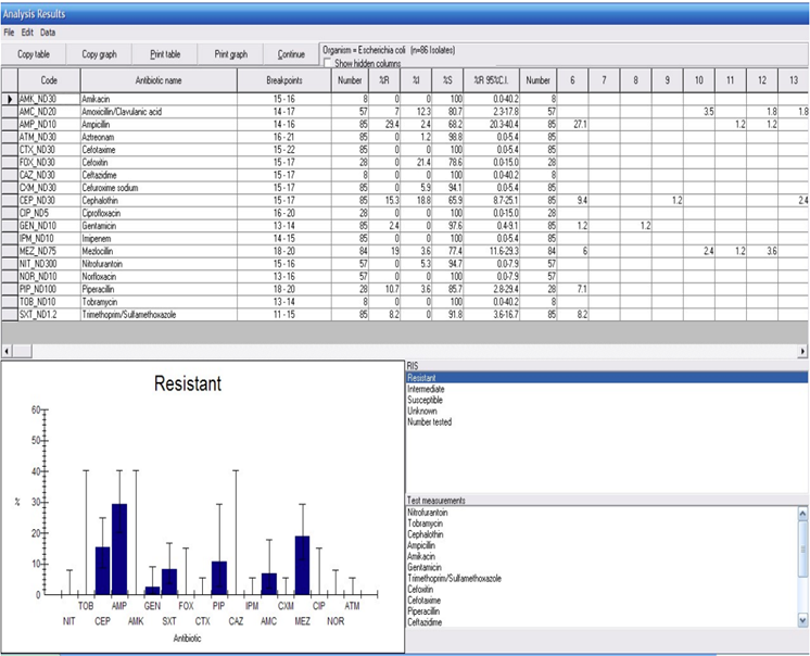 A screenshot of the WHONET software interface showing an analysis of Escherichia coli resistance patterns. (Photo Credit: IVI Digital AMR Hub Portal)